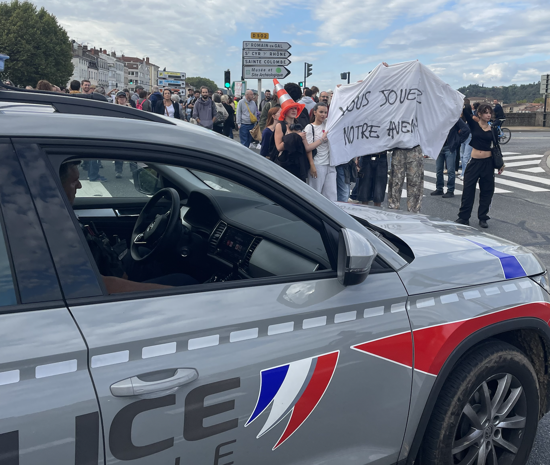 Avec à sa tête des lycéens d’Ella Fitzgerald à Saint-Romain-en-Gal arborant une banderole « Vous jouez notre avenir », la manifestation prit la direction des quais du Rhône en passant devant l’Office du Tourisme pour se diriger vers le rond-point stratégique, le passage obligé pour la circulation à Vienne, celui de la place Saint-Louis.