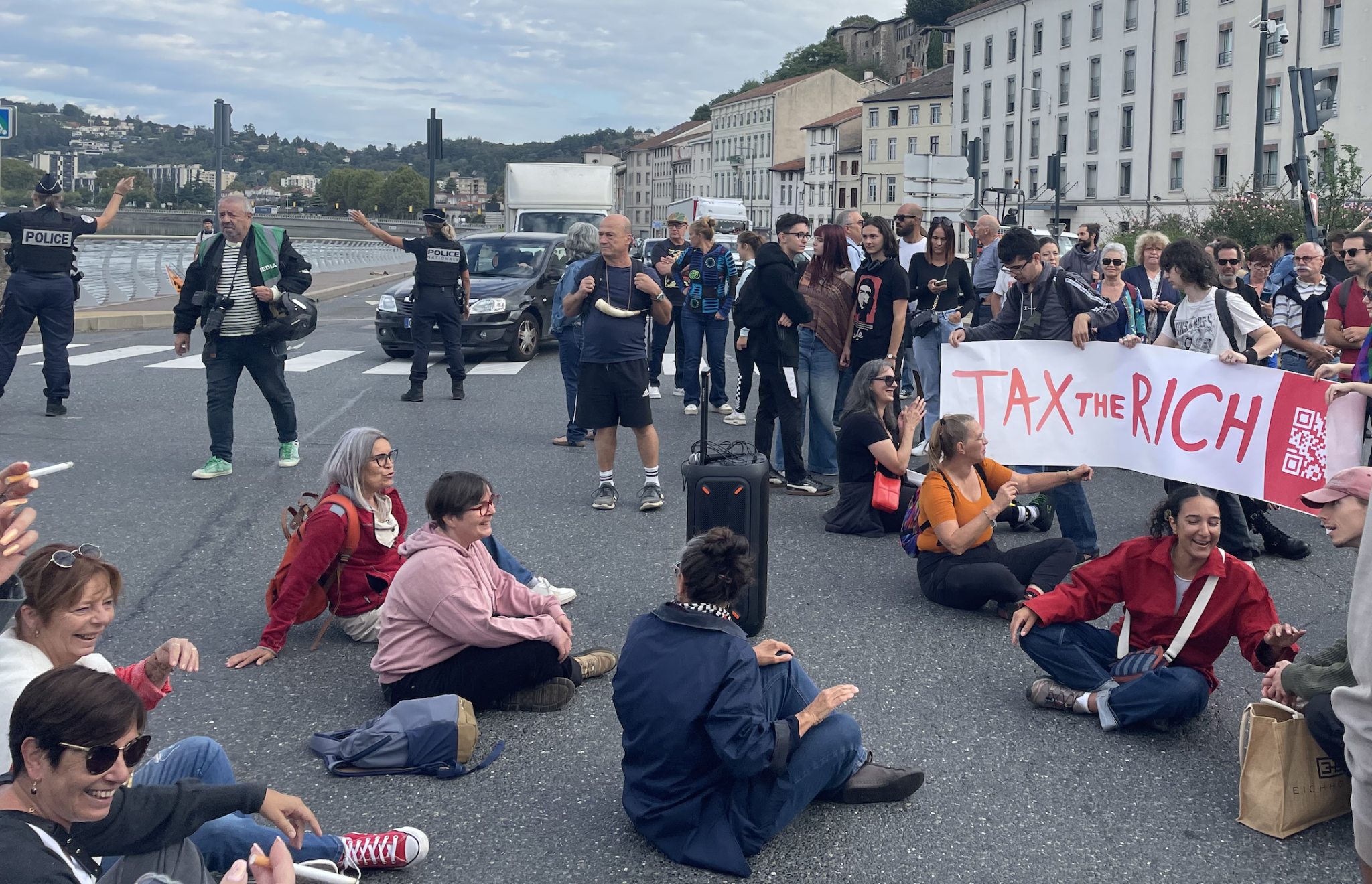Après s’être engagé à nouveau sur le quai du Rhône, mais en sens inverse cette fois, salué par les klaxons des conducteurs de poids-lourds, le cortège bloqua pendant une demi-heure le carrefour situé devant l’Office du Tourisme, au bout du cours Brillier, avant de se disperser.