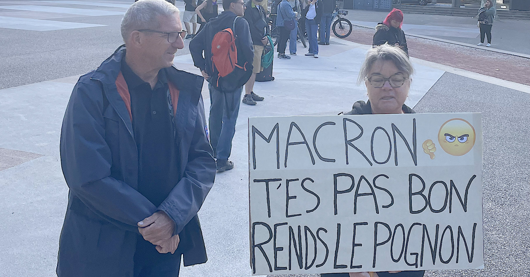 « Nous ne sommes pas en carte pour un parti politique, nous venons à titre personnel, nous sommes présents aujourd’hui pour nos enfants et petit-enfants », expliquent Mariedo et Rémy demeurant près de Vienne, en arborant la pancarte « Macron t’es pas bon, rend le pognon »…