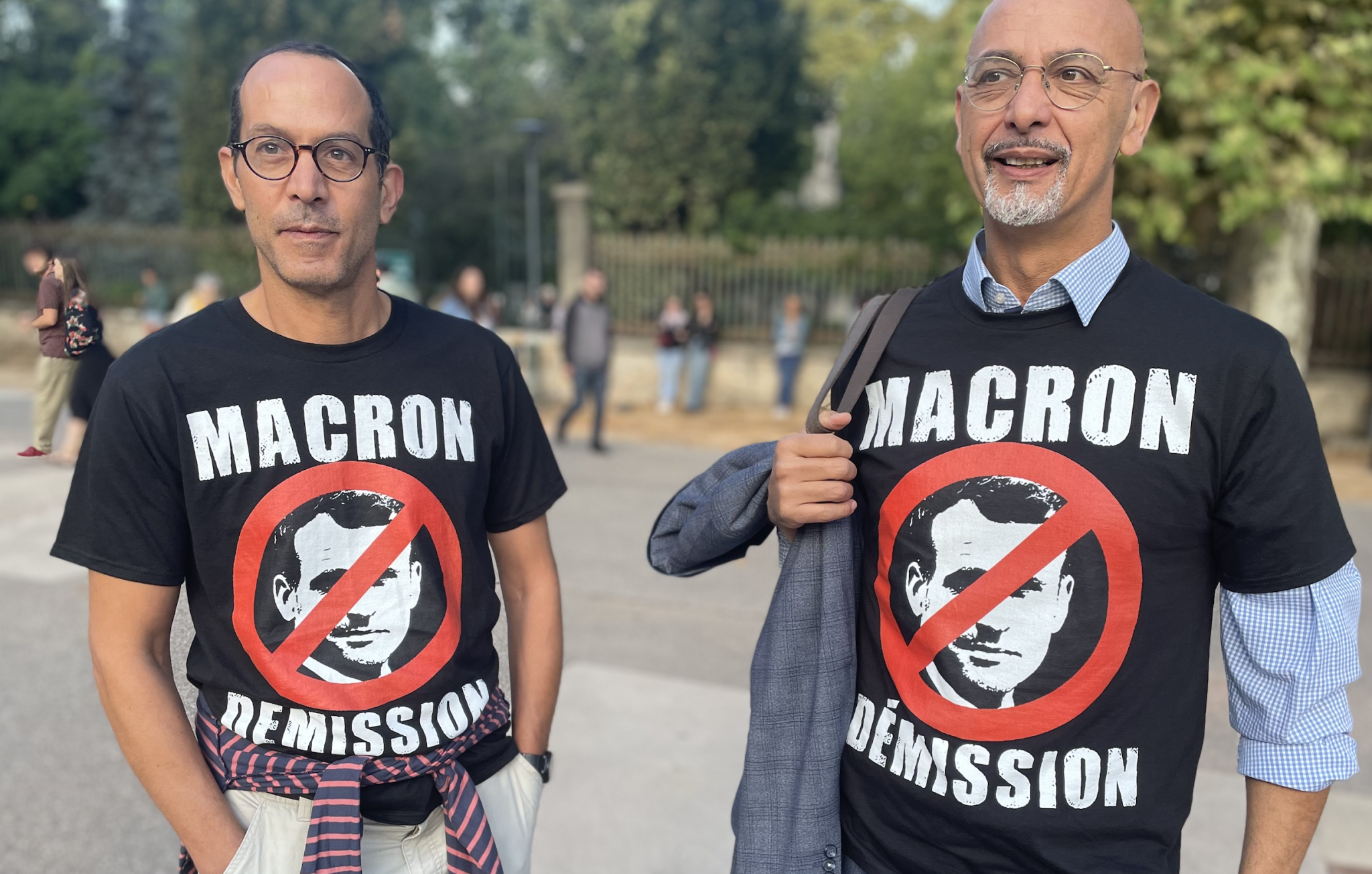 Idem pour deux profs (éco et math), Mohamed et Didier qui se font remarquer sur la place Simone Veil, le lieu de rendez-vous de « Bloquons tout », en arborant chacun un tee-shirt noir et rouge : « Macron démission ». « Nous sommes présents pour que dire que le désordre c’est Macron qui l’a installé : nous pensons que la solution passe par sa destitution ! ».